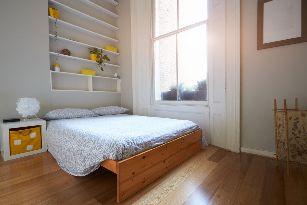 Barely able to walk around your bed? If you’ve no room for a nightstand, then all is not lost. Think shelving instead. You can run shelves all around the walls, as high up or low down as you need. A hanging shelf right next to the bed is an ideal space-saving alternative to a piece of cumbersome furniture.
