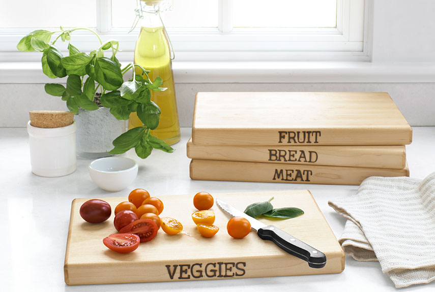 Personalize your wooden chopping boards with hotel metal stamps and a wood burning pen. You can use them to prevent cross contamination and label each board with different food items such as 'fruit', 'bread' and 'meat', or put your family's name on them.
