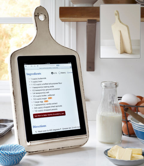 A lot of people now resort to going online for recipes rather than reaching for a cookbook. View recipes on a tablet without straining your neck, by creating a tablet holder using a cutting board and a few other simple materials.