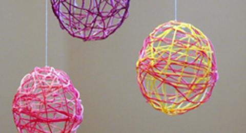 Simple, pretty, and totally versatile, these Easter egg ‘ornaments’ can be hung on a tree outside your home, on a garland for your mantle piece, and even be made into an Easter wreath. The possibilities are endless! Your supplies? Small balloons, embroidery floss, scissors, a pin, fabric stiffener, and string (if you choose to hand your eggs). The key is blowing up the balloon just enough so that it realistically resembles an egg – that’s how these ornaments get their shape.