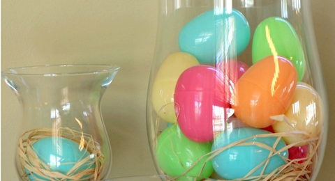 These vases make awesome table centerpieces, or accent pieces around your home –and they can be put together in minutes! We liked these vases from allthingsgd.com because they vary in size, and use a little of the stuff that’s typically found in Easter baskets in addition to some brightly colored eggs. Of course, you could also fill your vases with various jelly beans, peeps, or other colorful Easter candies.