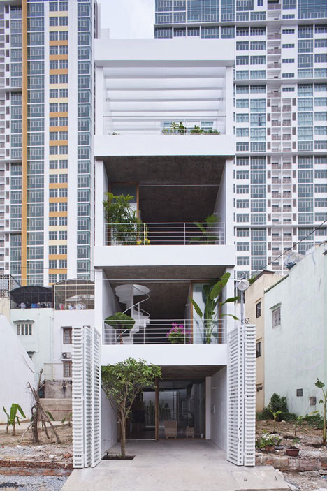 Designed by Sanuki + Nishizawa, this four storey family home is another interpretation of the Vietnamese tube house. To keep the home bright and airy, the architects introduced light wells, exposed staircases, and created flexible partitions to maximize the amount of natural light that could be let into the home.