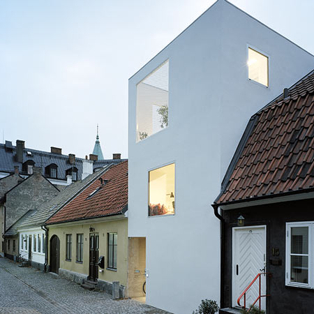 This skinny home fills a five meter gap in a formerly vacant street lined with traditional terraced cottages. The unconventional ceiling heights allowed for three floors to be created and an overall height that aligns well with the neighbouring rooftops. It also helped architects at Elding Oscarson to create a kitchen, dining, living, and bedroom spaces that span the width of the home.