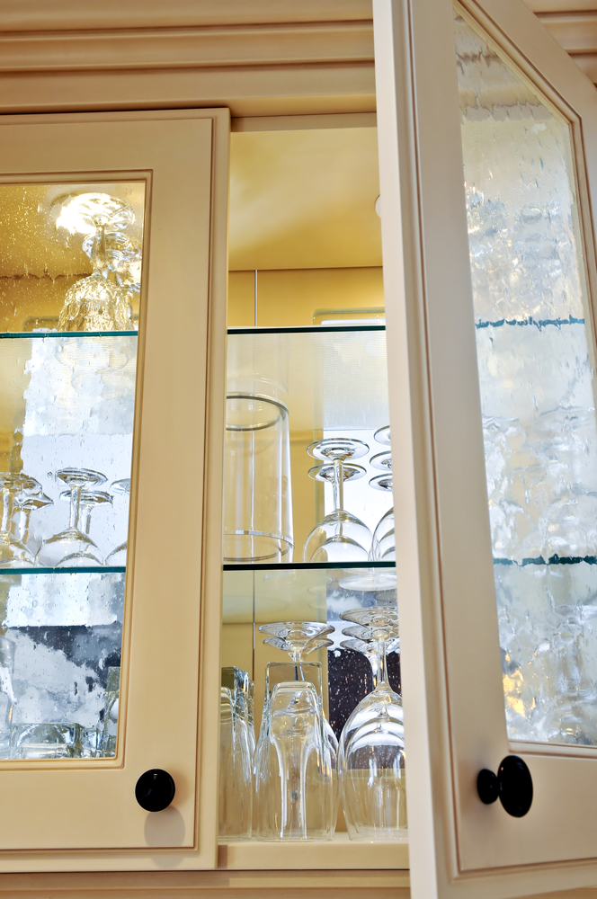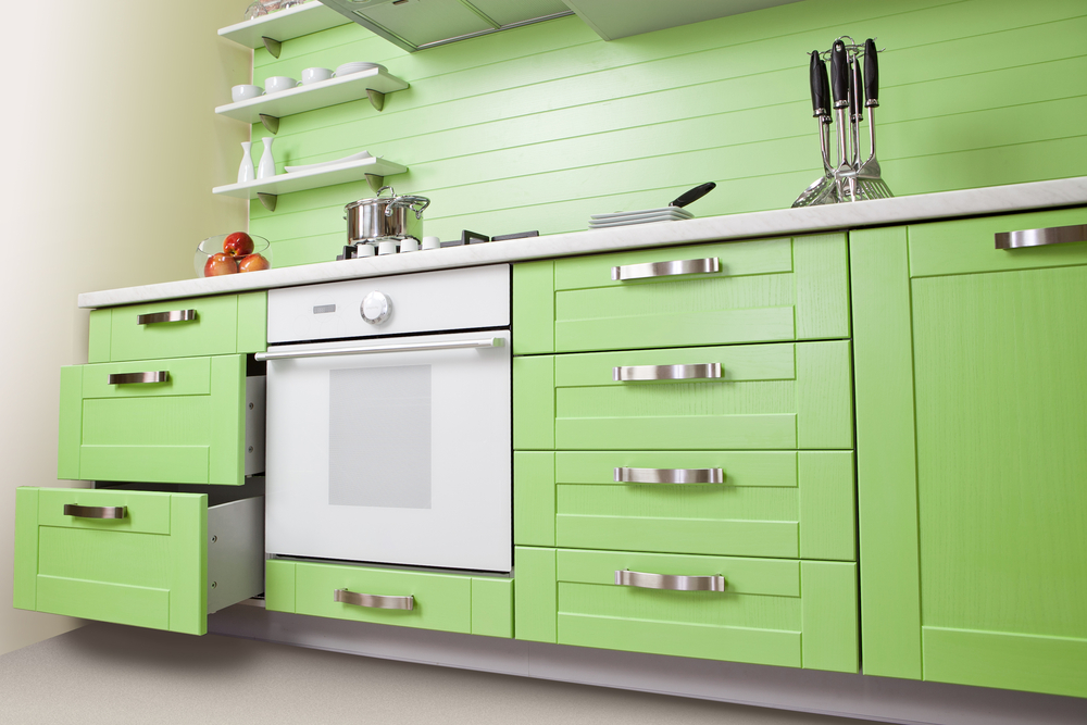 Remove the doors of your cabinets entirely and instead go for a more open-concept view to open up the space of a room. Fill hinge holes with putty before painting the exterior panes your desired color. Paint the cabinet interiors a contrasting color. If you don’t want to leave your dishes exposed, you can always replace your cabinet with a glass-fronted cabinet door for a similar effect.