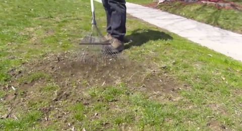 With the mixture on your lawn, it’s time to get the rake out again to really ensure that you’ve got the garden soil and lawn seed distributed as evenly as possible across your grass. Work from one side to the other, this time finishing by making rows with your rake just as you would in a garden. This step helps to promote good seed to soil contact, which is vital for successful over seeding.