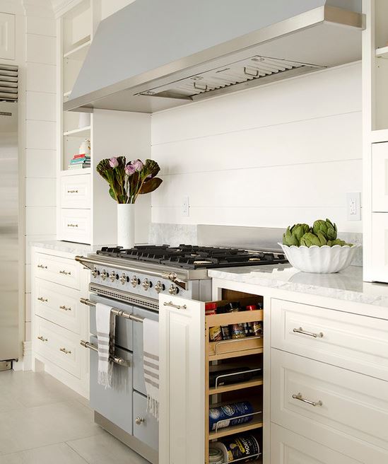 Many people today are opting for a spice storage cabinet that is inserted into the sides of your stove and pulls out when you need to reach for cooking spices. This is a very practical idea for anyone who loves to cook and a great way to hide all the spices and free up counter space.