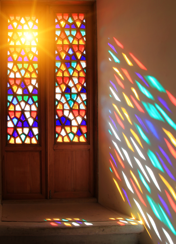A stained glass door or window not only adds color to you home in itself; it has the added advantage of splashing your subdued-shade-walls with rainbows when the light comes through it. Can’t afford new to fit new glass into your frames? Fake it with an adhesive window treatment.