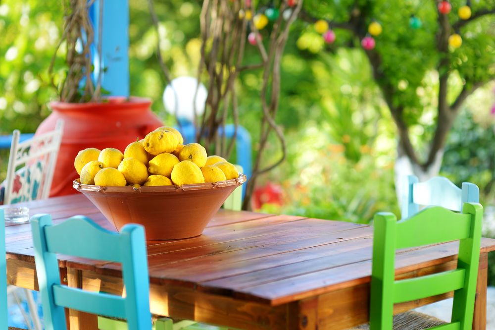 When it comes to small spaces, less is more: a riot of clashing, bright colours looks great in an outdoor setting, like this one, but when you’re inside and the walls are close, aim for no more than two to perk up your soothingly neutral, space-enhancing backdrop.